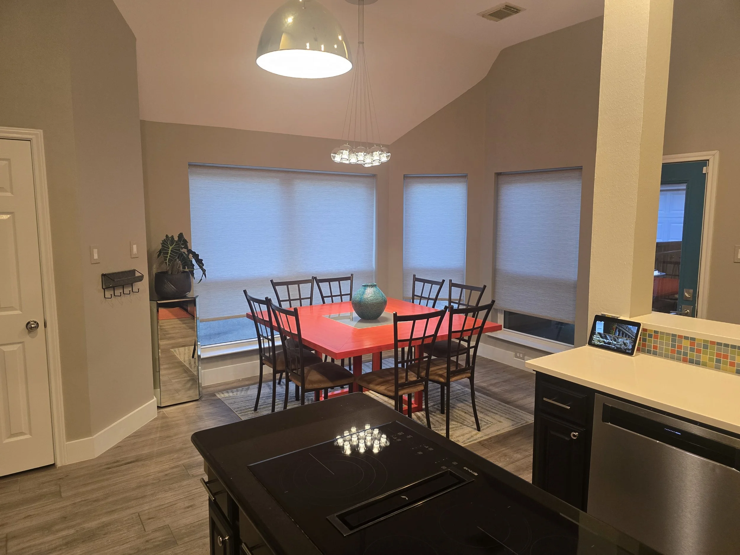The granite was replaced with arctic white quartz countertops and we installed an Elkay caviar quartz sink to transition to the black island. We brought in a chrome Kraus kitchen faucet for a cleaner, more updated look. The Kendall Sputnik chandelier, along with Trent Austin’s Bedford pendant lights, give more than enough light in the kitchen to intensify the colors on the backsplash. The back door was also painted with Cruising [SW 6782] to have the office color present, but not forgotten. The converted white walls painted with Extra White [SW 7006] paint gives the kitchen a more modern look and enhances the look of the backsplash.